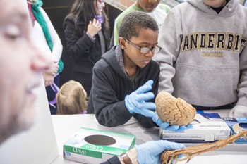 Ja’Mari Young, 9, examined a human brain during last year’s “Brain Blast” event at Vanderbilt Health One Hundred Oaks. (photo by Daniel Dubois)