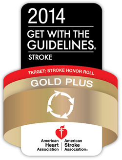 The Stroke Center was recognized with the Get With The Guidelines Gold Plus Achievement Award for implementing quality measures designed to help hospital teams provide the most up-to-date, evidence-based guidelines with the goal of speeding recovery and reducing death and disability for stroke patients.