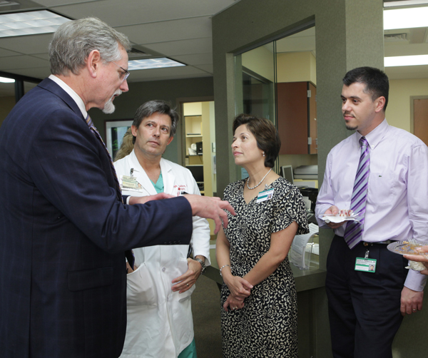Al Powers, M.D., left, talks with Ralph LaNeve, M.D., Shubhada Jagasia, M.D., and Ioannis Papagiannis, M.D., at a recent event celebrating the opening of the Vanderbilt Eskind Diabetes Clinic in Franklin. (photo by Anne Rayner)