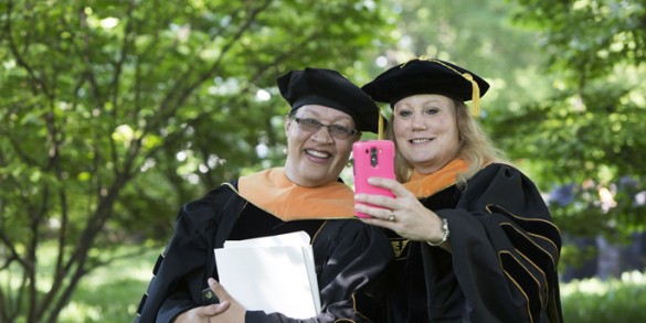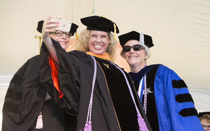 Tiffany Gwartney takes a selfie with Terri Allison, DNP, R.N., left, and Mavis Schorn, Ph.D., APRN, CNM, at the School of Nursing ceremony. (photo by Susan Urmy)
