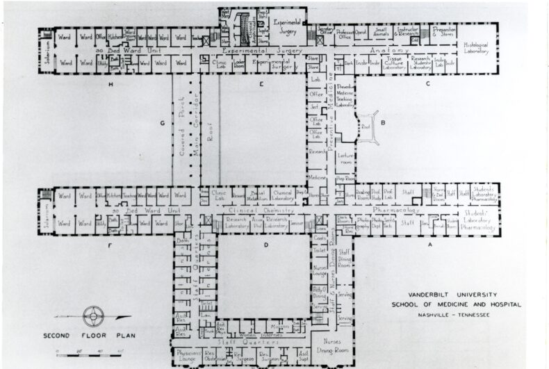 In 1925, the VUH and VUSM building, with its 208 patient beds, became a literal home for those first 12 men. They were “residents” or “house staff” after all. On the second floor, near the crossing of corridors B and S, there was a house staff dormitory. All house staff in those early years were unmarried and bunked together during off-duty hours. Female residents that would soon join the ranks had a segregated suite of rooms reached by a more private stairwell at the corner of corridors A and T. A small dining room adjoining the house staff quarters served residents and faculty alike, elbow-to-elbow at shared tables. Mealtime discourse often focused on challenging cases or promising research.