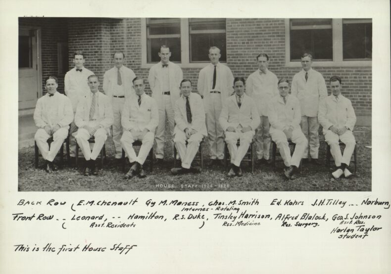 This was the first group of medical residents or house staff to begin their duties at the landmark health care facility just off 21st Avenue in Nashville (now Medical Center North). Here, they received instruction from nationally reputed faculty, cared for patients on the wards, worked alongside their mentors in research laboratories, and even ate their meals and slept at this location.
