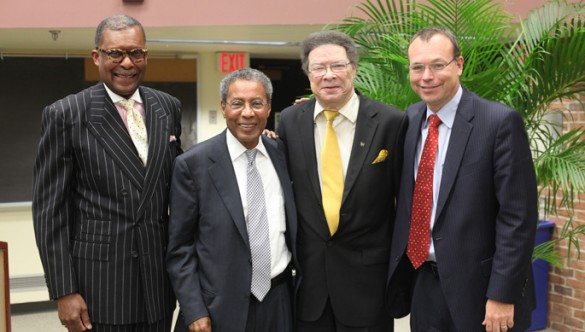 Harvard’s Alvin Poussaint, M.D., second from left, delivered last week’s Levi Watkins Jr. Lecture. With him are, from left, Andre Churchwell, M.D., Levi Watkins Jr., M.D., and Jeff Balser, M.D., Ph.D. (photo by Daniel Dubois)
