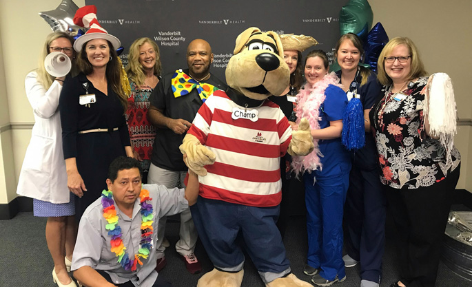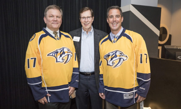 Representatives from the Nashville Predators joined Vanderbilt University Medical Center (VUMC) leaders for a special reception to recognize the team’s historic season and the medical care provided by VUMC. Vanderbilt Sports Medicine provides comprehensive medical coverage for the Predators, and Vanderbilt LifeFlight Event Medicine provides emergency medical treatment and first aid at all games. The June 28 event celebrated all of these clinicians and also recognized the leadership and contributions of John Kuhn, M.D., left, and Paul Rummo, D.O., right, pictured here with David Poile, General Manager of the Nashville Predators.