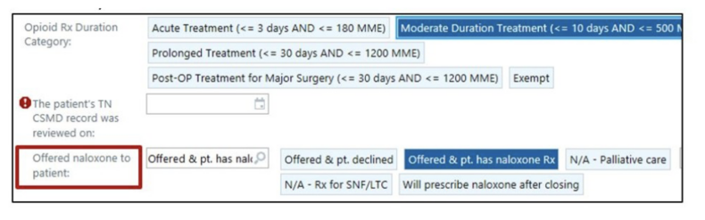 New order question for documenting offering naloxone to patients with an opioid prescription of more than 3 days and other high-risk features (TN Code 53-11-308).