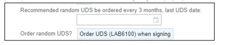 If the patient has been taking opioids for more than 90 days, a question will show if they are due for a random urine drug screen (UDS) per TN Chronic Pain Guidelines. If you want to order a UDS, click the order random UDS box, and a prompt to add the LAB6100 test when signing will pop up.
