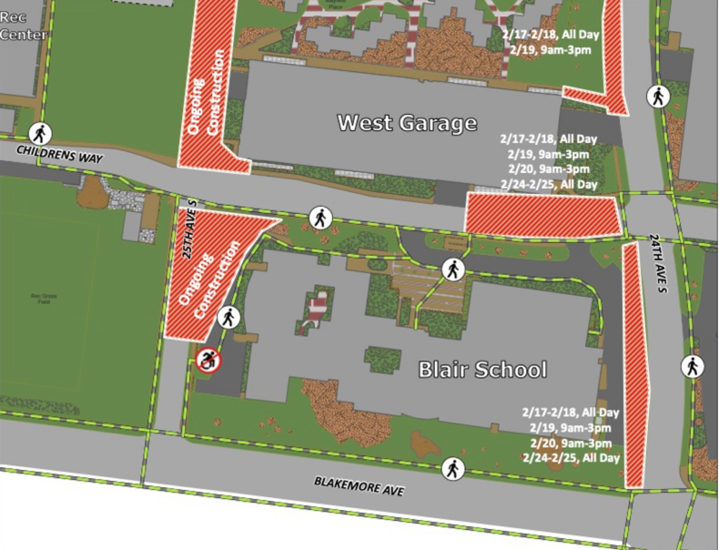 The 25th Avenue Garage will be open, but access to it from 25th Avenue will remain closed at Blakemore Avenue. Medical Center-affiliated parkers should continue to enter the garage from 24th Avenue; University-affiliated parkers should continue to enter the garage from Highland Avenue.