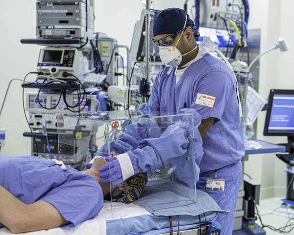 The intubation box, a four-sided fabricated enclosure used during endotracheal intubation, helps shield a caregiver from being exposed to COVID-19 by containing droplets expelled by the patient during the procedure.