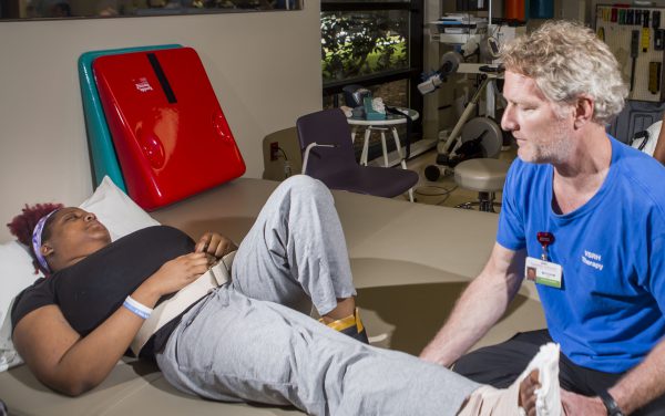 Physical therapist Mitchum Warren works with Tia at Vanderbilt Stallworth Rehabilitation Hospital. Photo by Susan Urmy