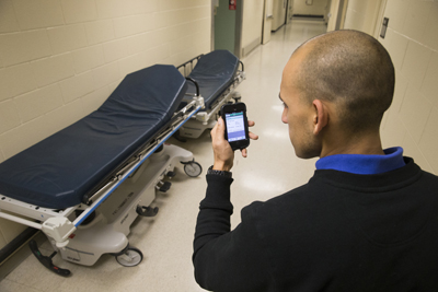 Luis Comacho and his colleagues in Patient Transport are now using iPods to coordinate transport assignments. (photo by Joe Howell)