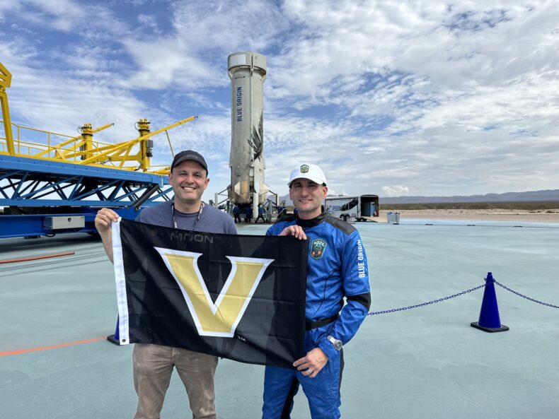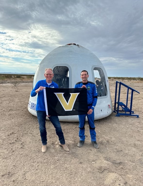 In addition to bringing Vanderbilt University pendant flags aboard the flight, Jahangir brought a wearable device to collect data, including his heart rate variability and respiratory rate.