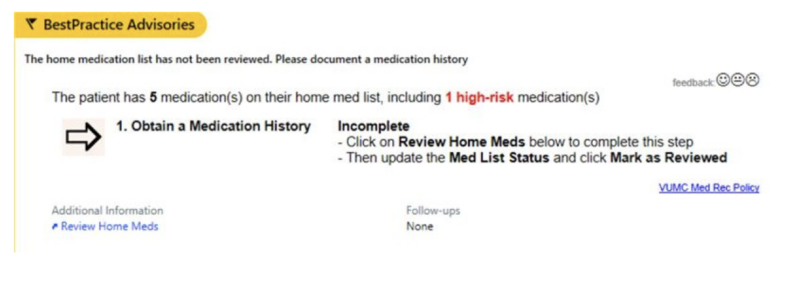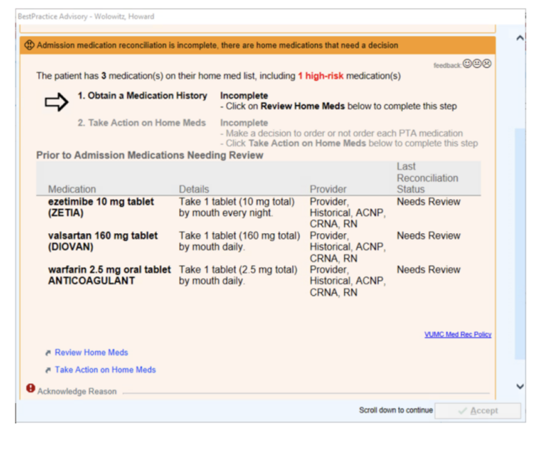 The Medication Reconciliation best practice advisory will be updated to display medications that need review or decision when there are three or fewer. This change, which affects inpatient providers, pharmacists and nurses, will take effect Nov. 27. The change should make it easier for inpatient clinicians to know when new medications have been added before admission medication list that need review and/or decision-making.
