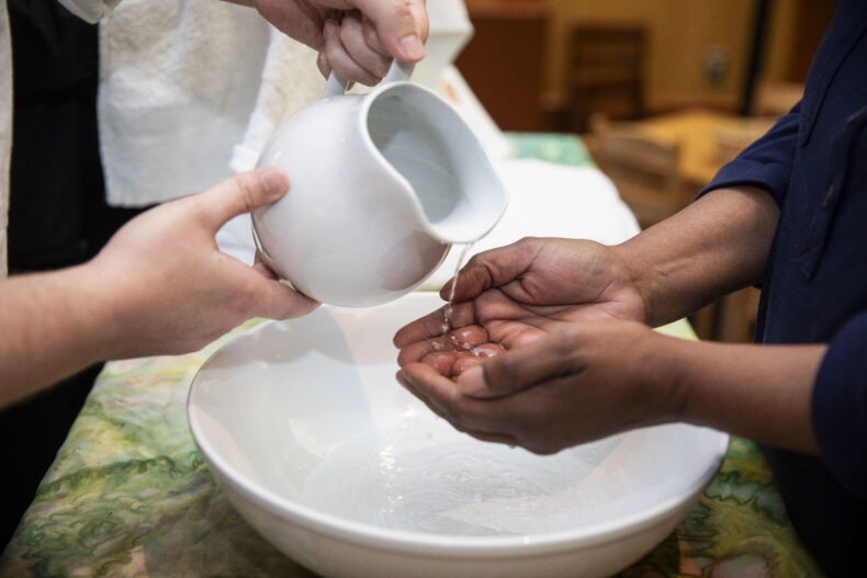 Raye Nell Dyer, right, chaplain with the Department of Pastoral Care, performed the Blessing of the Hands ceremony with medical assistant Debbie Bowers Wednesday in the chapel at Monroe Carell Jr. Children’s Hospital at Vanderbilt.