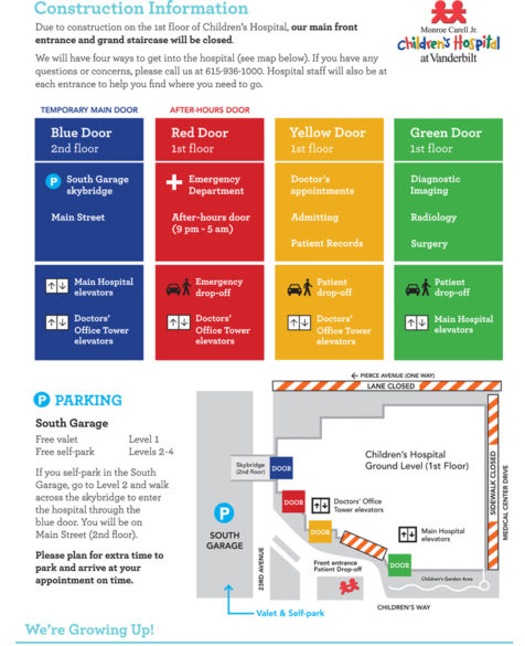 With construction in full swing at Monroe Carell Jr. Children’s Hospital at Vanderbilt, the hospital is offering helpful tips for staff on which entrances to use and how to get around the facility during the lobby closure.