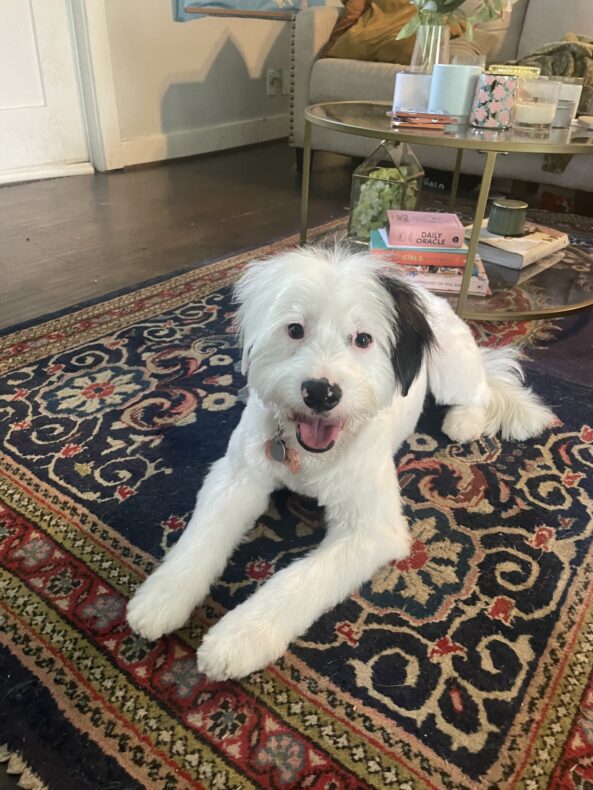 Today’s Dog of the Day is Rosie, submitted by Mackenzie Paris of 9 North VUH. “Rosie is a rescue who spent the first few weeks of her life living in the woods after she and her brothers were dumped there. She is my feral girl! She has acclimated very well to life indoors and loves to snuggle. She still enjoys snacking on dirt occasionally when she is outside (much to my dismay as she is a white dog). She is the sweetest girl, and she loves talking to us!“
