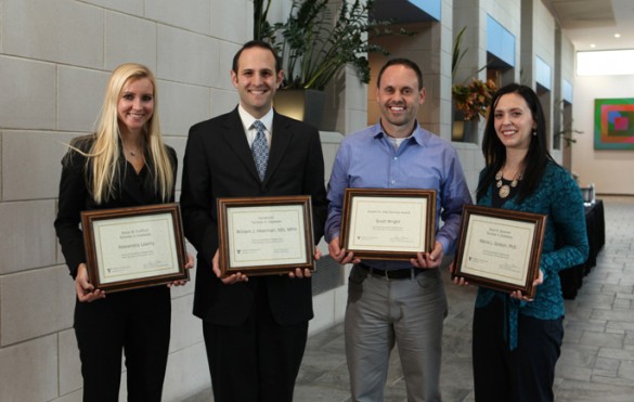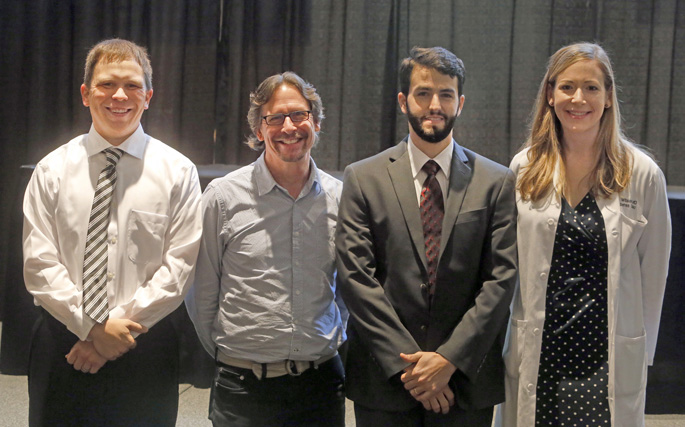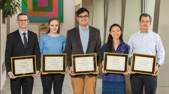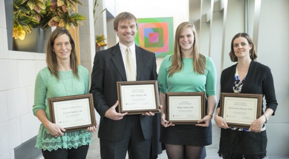 Research achievement was recognized recently during last week’s Diabetes Day at the Student Life Center. Among those honored were (from left) Matthew Bechard, Ph.D., postdoctoral fellow in Cell & Developmental Biology, winner of the Daryl K. Granner Scholar in Diabetes Award; Greg Poffenberger, senior research specialist in the Division of Diabetes, Endocrinology and Metabolism, winner of the Robert K. Hall Service Award; Nicholas Vierra, graduate student in Molecular Physiology and Biophysics, winner of the Vanderbilt Scholar in Diabetes Award; and Jessica Wilson, M.D., MSCI, clinical fellow in adult Endocrinology, winner of the Oscar B. Crofford Scholar in Diabetes Award.