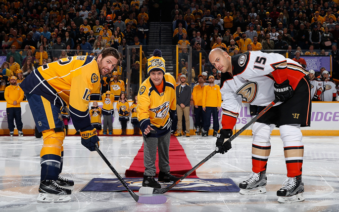 Max Hermsdorfer, center, served as patient ambassador for Monroe Carell Jr. Children’s Hospital at Vanderbilt at the recent Nashville Predators Hockey Fights Cancer Night. Here, Hermsdorfer drops the puck with Predators’ captain Mike Fisher, left, and Anaheim Ducks’ captain Ryan Getzlaf. Over the past seven years, the Predators have raised and donated more than $1 million to Children’s Hospital, with more than $500,000 going to the Nashville Predators-365 Pediatric Cancer Fund.