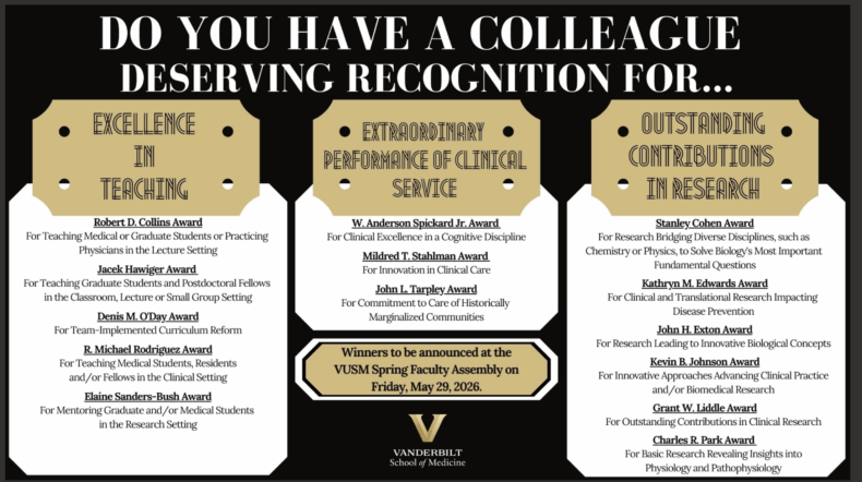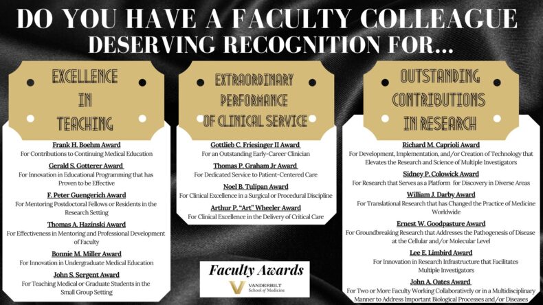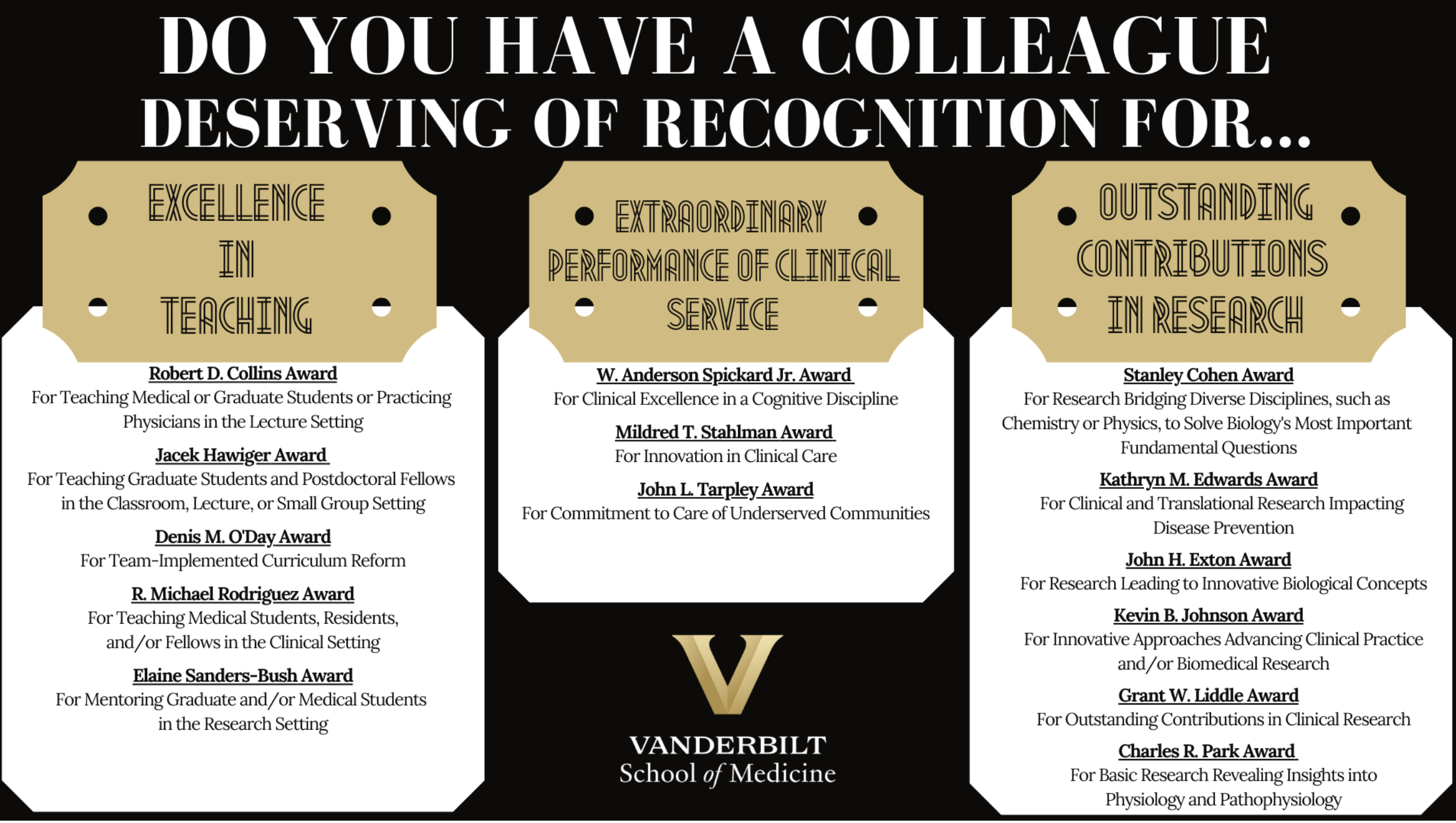 Please exclude any previous winners of the same award from nomination. The historical list can be found here. If you have any questions, please contact Lisa Tarr, senior program manager of Faculty Development. (lisa.tarr@vumc.org)
