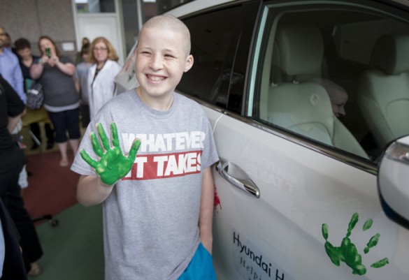 The children also dipped their hands in colorful paint and placed their handprints on a white Hyundai Santa Fe to represent their personal stories of courage and hope.