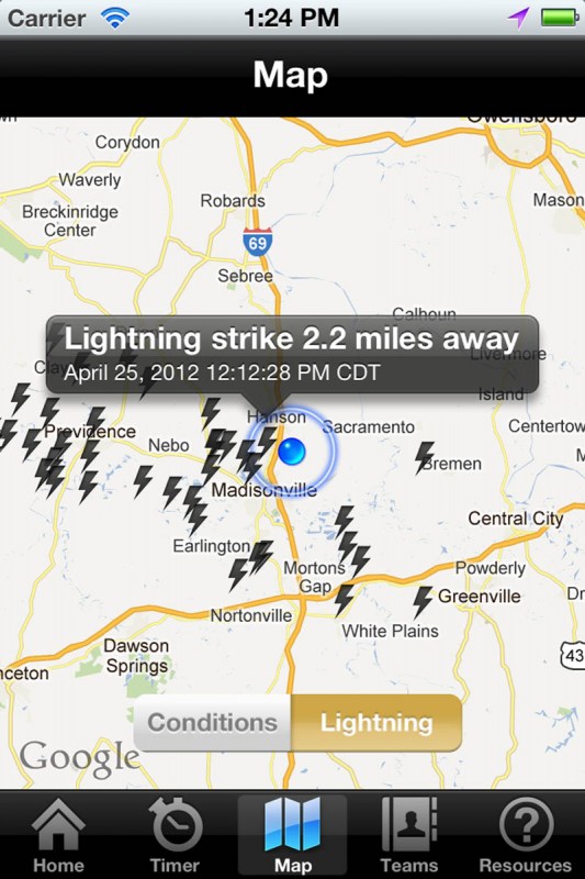 In a survey of local coaches during the development of the app, the most requested feature was a lightning warning. If lightning strikes nearby, the app sends an alert to the phone and the resource section provides information on what to do.