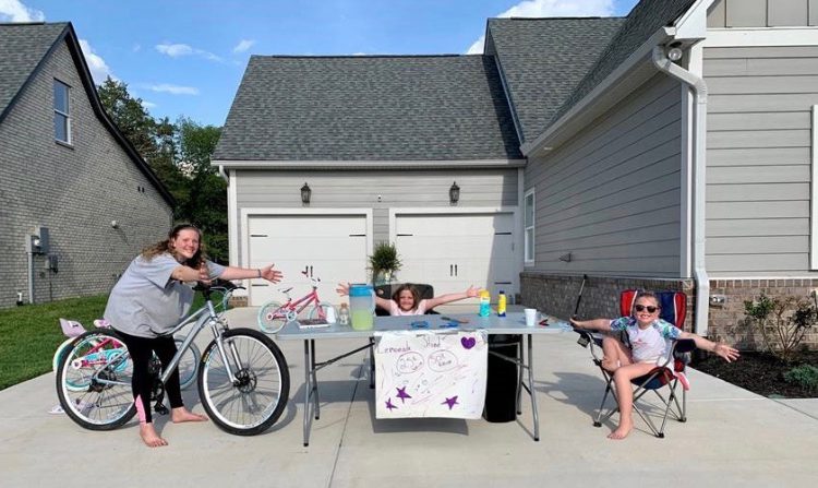 Stratton Rose Thompson, right, started her lemonade stand and soon had help from neighbors Mya and Layla Rockensock. The stand raised $118 for Vanderbilt Wilson County Hospital and its employees to support their care for COVID-19 patients. Photo courtesy Cassy Thompson