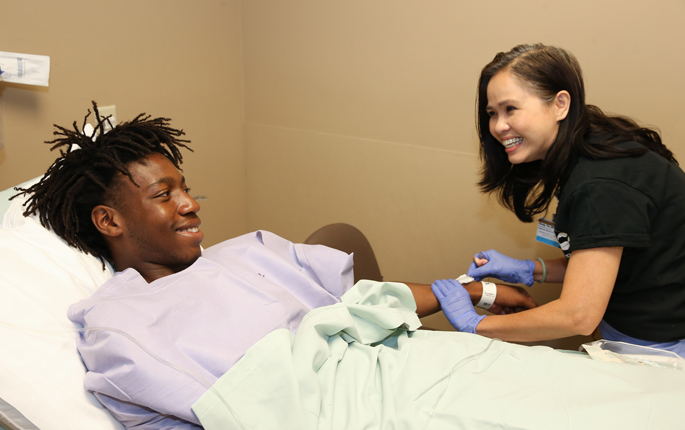 Cathey Butler, R.N., left, shares a laugh with patient Demy Lemus during the recent Vanderbilt Orthopaedic Outreach Day. (photo by Terry Wyatt)