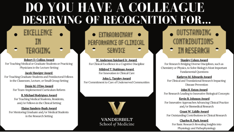The annual Awards for Excellence in Teaching, Extraordinary Performance of Clinical Service, and Outstanding Contributions to Research are proud Vanderbilt traditions.