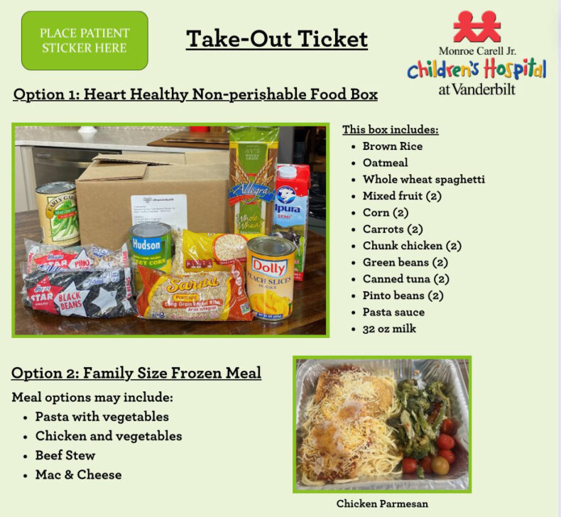 If the screening shows the presence of food insecurity, families receive a “Take-Out Ticket,” a voucher for a box of nonperishable food or a family-size frozen meal upon discharge.