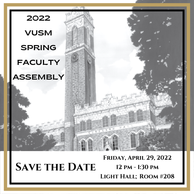 The 2022 Vanderbilt University School of Medicine Spring Faculty Assembly will be held in person this year beginning at noon on Friday, April 29, in 208 Light Hall.