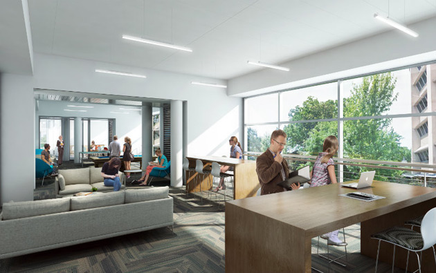 The second-floor student lounge of the Eskind Biomedical Library renovation. (Rendering by Hastings Architectural Associates)