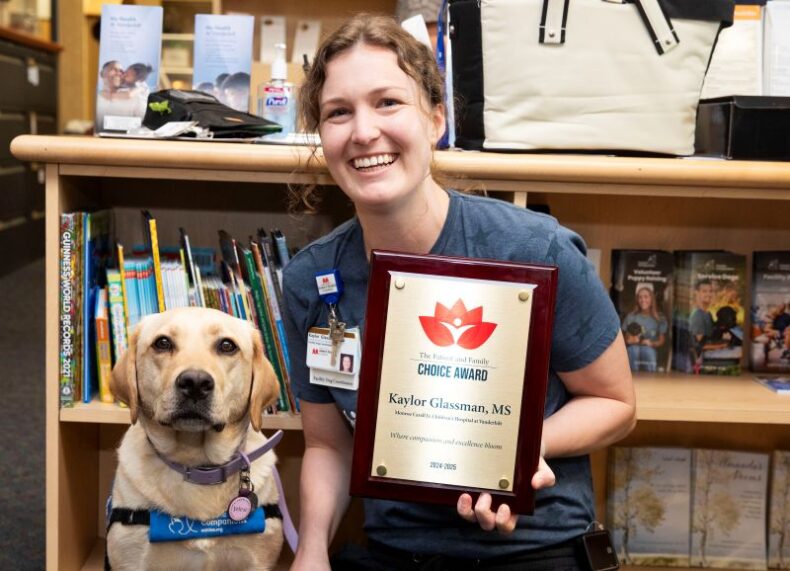 Her nominator’s family wrote, in part: “We know that our experience isn’t unique and that the work that Kaylor and Velour are doing together makes a difference for children and families facing tough medical challenges. Kaylor isn’t just Velour’s handler — she is a source of comfort, positivity and unwavering support. She played a crucial role in our son’s recovery, and her kindness and dedication made a lasting difference in our journey at Vanderbilt. She exemplifies what it means to truly care for patients and families.”