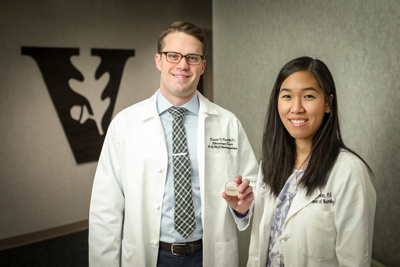David Kent, MD, and Huong Pham, MD, with the device that treats sleep apnea. (photo by John Russell)