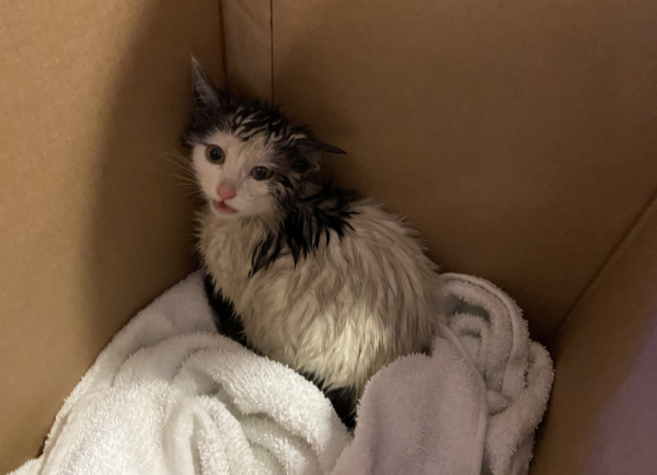 It was a gray, miserable winter day, the second full day of hard, cold rain after four days of snow and below-freezing temperatures, and the black-and-white kitten was soaked.