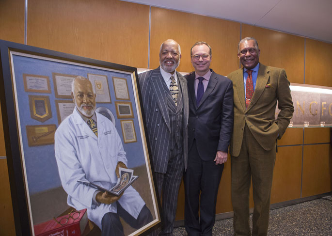 Arnold Malcolm, MD, MBA, left, Jeff Balser, MD, PhD, and André Churchwell, MD, pose with the portrait of Malcolm that was unveiled at a special reception last week honoring his career accomplishments and service to the Medical Center and School of Medicine. Malcolm was chair of the Department of Radiation Oncology from 2010 to 2015, and under his leadership the department cemented a culture for delivering world-class oncology services, scientific discovery and educating leaders.
