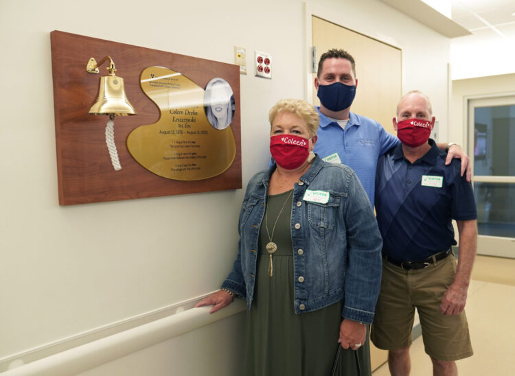 On Aug. 4, 2021, Coleen’s husband, Mark, and a caravan of more than a dozen family members traveled from the Philadelphia area to Vanderbilt to celebrate her life with the Vanderbilt Heart Transplant team. They donated a special plaque with Coleen’s picture on it and a bell, which was installed on the seventh floor of Medical Center East. Transplant patients will be invited to ring the bell in celebration as they leave the hospital with their new organs. Its joyful chime will celebrate patients, their organ donors and medical team members who make transplants possible, and the life of Coleen.