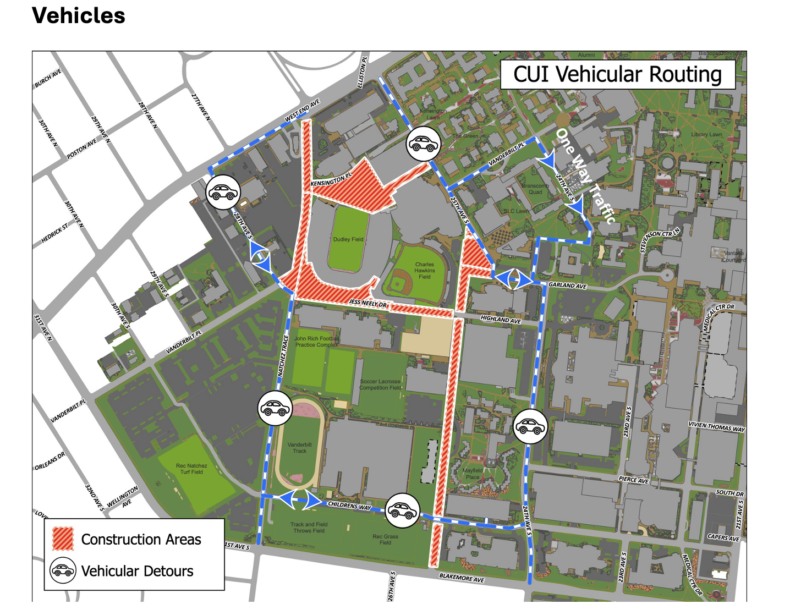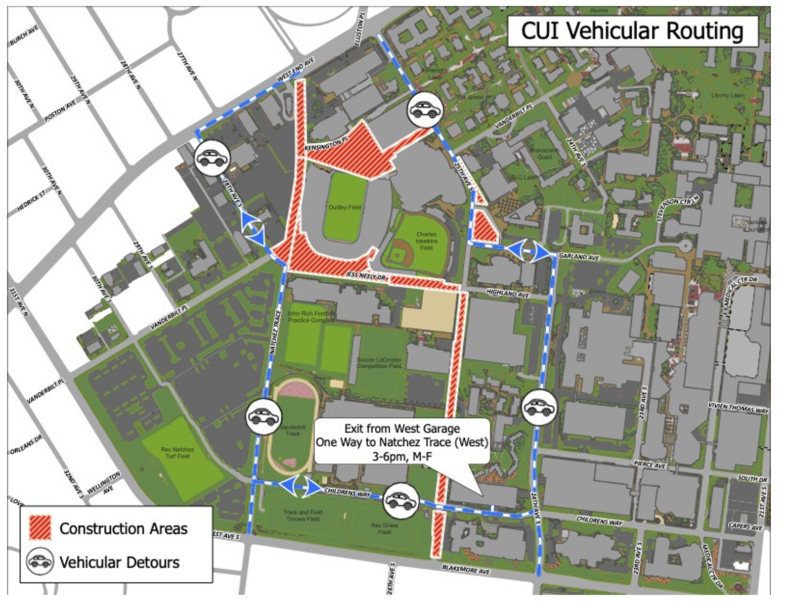 As part of Vanderbilt University’s Central Utilities Initiative (CUI) project in the Frist Athletics Neighborhood, the vehicular and pedestrian routes in the area are changing.