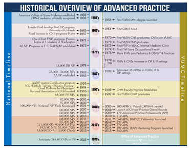 This timeline gives an overview of the history of advanced practice nursing at Vanderbilt and nationally.