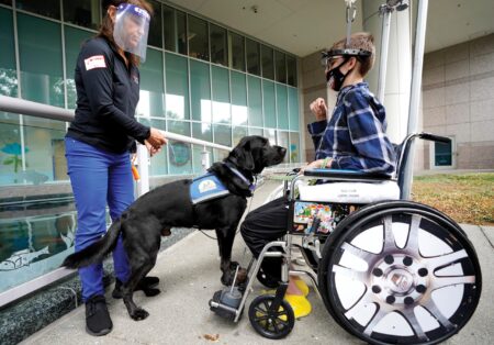 D.J. sits down carefully in a wheelchair outside his room and Grissim hands him a short leash designed just for patients. She holds Squid’s longer leash attached to a prong collar designed for training. “You show us the way, D.J.,” Grissim says. “We’ll follow you.”