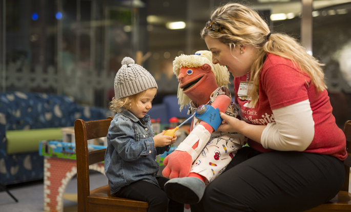 Elise Pillsbury plays with Child Life specialist Emily Powell. Puppets are used to explain procedures to children. (photo by Daniel Dubois)