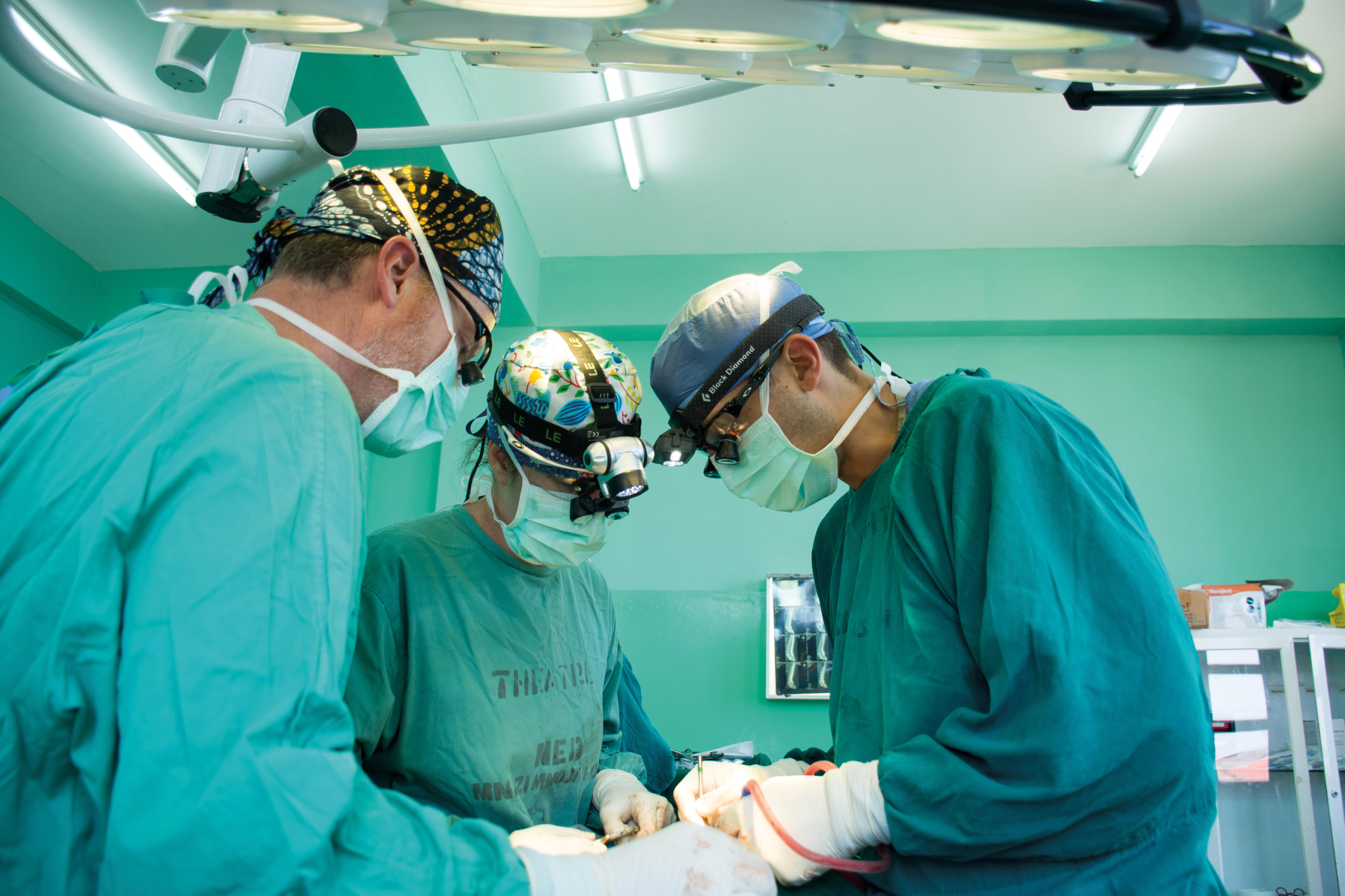 Thompson, physician assistant Amanda Wright, and Scott Zuckerman, MD, in surgery. Photo by Ash Gallery.