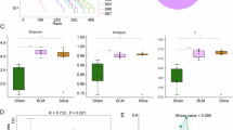 Using linear discriminant analysis (LDA) to examine species-level differences in the gut microbiota, 10 taxa were overrepresented in ABSL-1 mice and 5 taxa were overrepresented in ABSL-2 mice (Fig. 2d). The overrepresented taxa in ABSL-2 mice included Lachnospiraceae bacterium A2, Lachnospiraceae bacterium 28-4, Firmicutes bacterium ASF500, and Romboutsia ilealis. Higher relative abundance of Firmicutes in the lung microbiota of bleomycin-treated mice with fibrosis has been reported7. Species overrepresented in ABSL-1 mice included Staphylococcus nepalensis, Dubosiella newyorkensis, Acetatifactor muris, Lactobacillus animalis, Lactobacillus murinus, and Acutalibacter muris. Of note, Lactobacillus species, which were overrepresented in ABSL-1 mice, have been shown to reduce IL-17A-mediated disease severity in other experimental animal models25,26,27, and were associated with notable reductions in respiratory symptoms28.