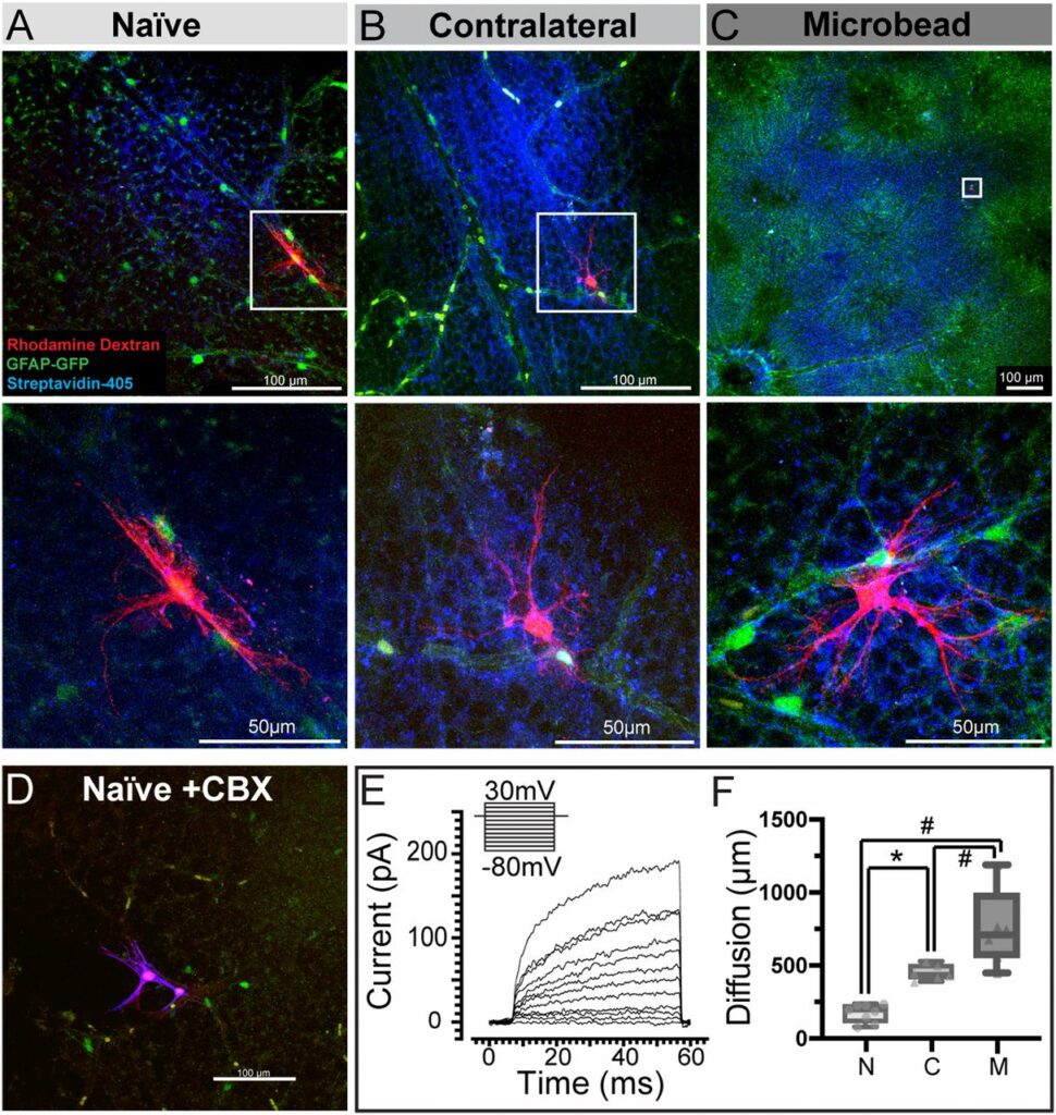 The transfer, the group discovered, is dependent on connexin 43 (Cx43), the protein that makes up the gap junctions in astrocytes, and which permits the exchange of small molecules between them. When Cx43 was genetically knocked out in a mouse model, the energy transfer did not happen within astrocyte networks between the two optic nerves.