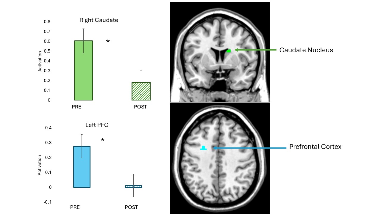 fMRI brain scans and adjacent charts show how activation in the caudate nucleus and prefrontal cortex declined during a study that provided eight weeks of therapy. (courtesy of Julia Sheffield)