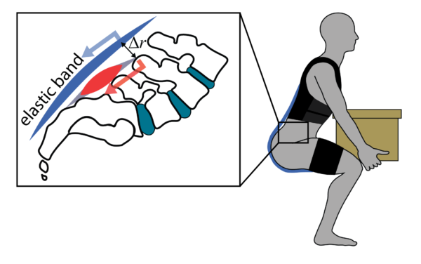 Elastic band (spring) in exosuit stretches during leaning and lifting, offloading low back extensor muscles (Zelik)