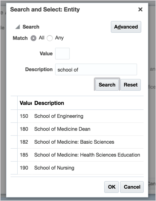 2. Enter your Expenditure Type Value. By clicking the drop down arrow beside the expenditure type field, you will be given the option to search for your expenditure type. Save the requisition once the expenditure type and organization have been entered correctly. Example: You have identified an expense type as a "Books and Subscription Expense". In the search field, you type "Book" and click search. You then receive an item in the search results with the description "Books and Subscription Expense" and the value, "BooksSubsc". Select this item.