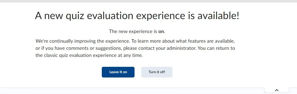 Figure: Click the arrow to view the message for enabling or disabling the new quiz evaluation experience.