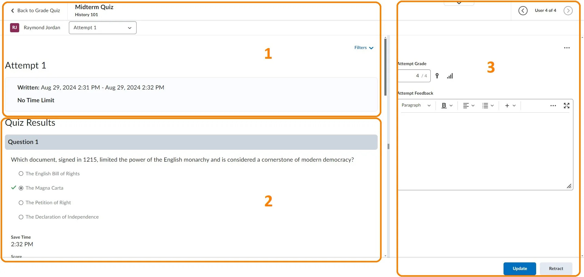 After instructors have opted into the new experience, they can scroll between users and select the quiz attempt they want to evaluate for the user.